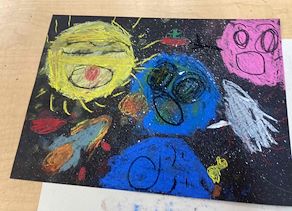 Students learned about the characteristics of the Elements of Art, including lines, shapes, colors, textures, form, space, and value. They traced circles and then used different value to give them form and turn them into spheres. They also had the option to use an action painting technique to splatter stars in their sky.