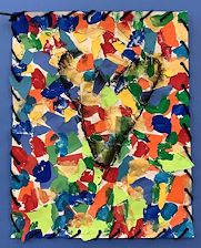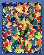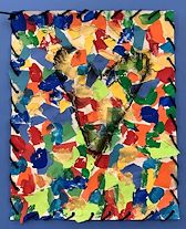 Students looked at the famous heart art of Cincinnati artist Jim Dine. In particular,we looked at his painting titled “Confetti Heart”. Students created confetti for the background of their paper by tearing and gluing paper in the color scheme of their choice, and adding dots of tempera paint. They created their own symmetrical heart template and added either one or four hearts to their paper by smearing black charcoal. Finally, they completed their art by doing a whipstitch around the outside edge of their paper.