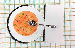 Students learned about mixed media and created a soup bowl on a placemat. This style of art is inspired by Pop Art of the 50’s. They drew horizontal and vertical lines and outlined them with marker. They used oil pastels to make the alphabet. They painted with liquid watercolor for the soup. They used charcoal to create a shadow on the side of the napkin and bowl. Plastic spoons were hot glued into place after all of the work was glued and painted.