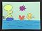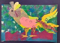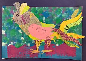 We learned how he makes specialty papers using different painting and printing techniques. Each student created various papers in different colors schemes, and then sponge painted a background sheet. Next we built our chickens using the collage technique, by cutting out different shapes one at a time. Students made choices on colors, aiming for contrasts that would stand out against their backgrounds. Cock-a-doodle-doo!